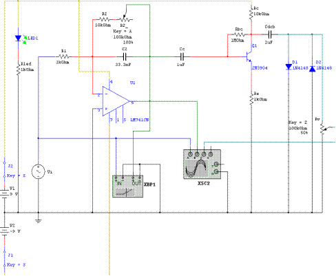 The circuit simulation program Multisim 7 is used to simulate the circuit behind the pedal. Figure IV.1 shows the circuit as implemented in simulation: