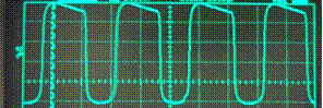 The four-channel oscilloscope is tied to the input signal, the output of the pre-distortion equalization stage, and the output of the amplification/cutoff stage. In the figures below, the blue line, green line, and cyan line represent these waveforms, respectively.