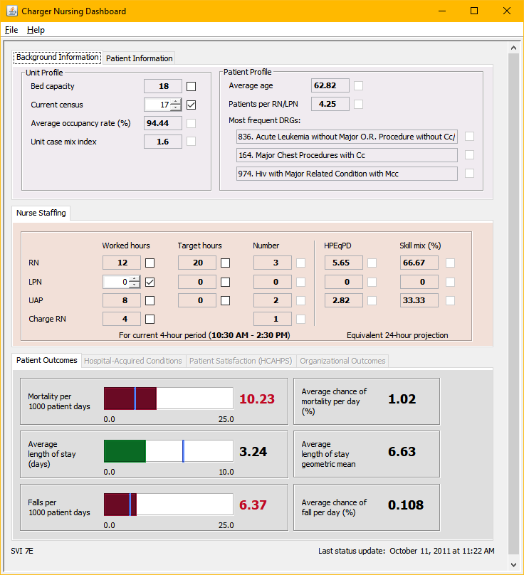 Data is populated in real time, with the option to manually override data; and four sets of outcomes (Patient Outcomes, Hospital-Acquired Conditions, Patient Satisfaction, and Organizational Outcomes) are calculated based upon this data. The Patient Information tab additionally displays real-time information about patients in the unit, which is useful in and of itself and also serves as input into the software’s equations.