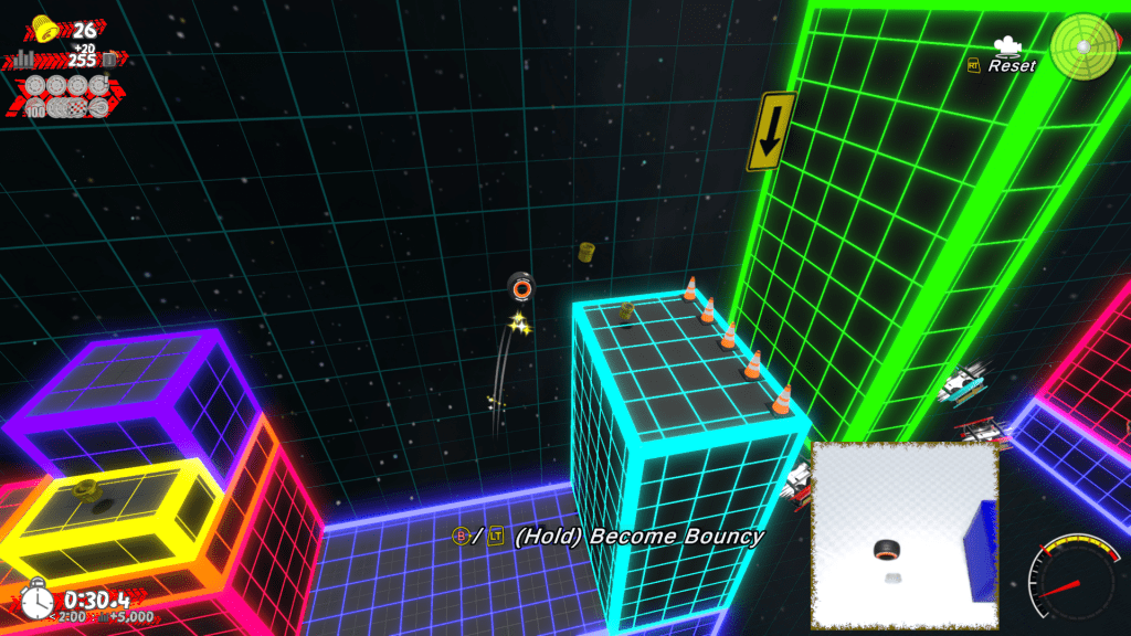 There are several different powerups into his obstacle courses for Tire Friend to find: magnets, wings, Arc-rated tire covers, and more. If you’ve hit a rough spot, you can equip multiple powerups at the same time to give yourself a leg up on the mysterious entity’s clever machinations. If you’re past a rough spot, you can store them for later!