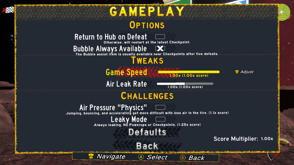 Tire Friend has granular difficulty options. Want to grab an assist item at the outset? Slow down the game to practice a level? Break your thumbs in Panic Mode? You can do all of that… and more!